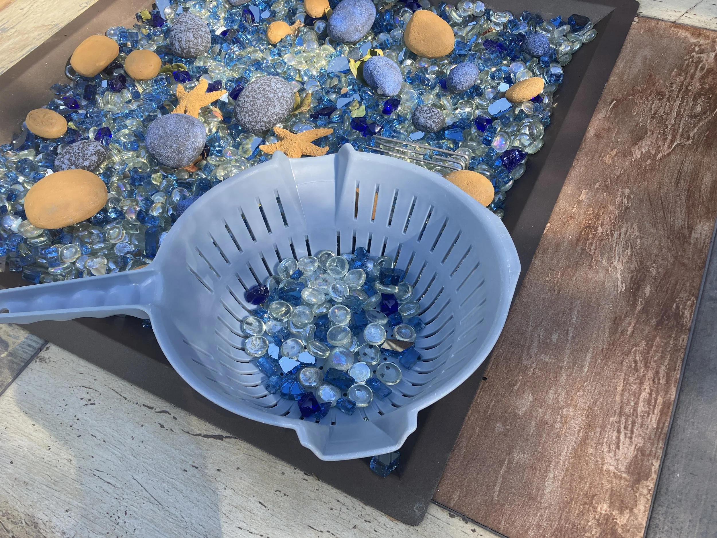 Pro Tip: An inexpensive plastic colander like the one shown below makes this process even faster. When you remove the fire glass from the soapy water, place it in the colander and then use fresh water to rinse. The excess water runs out of the colander, and you simply dump the fire glass on a towel, spread it out, and let it dry completely before reinstalling it in your fire feature.