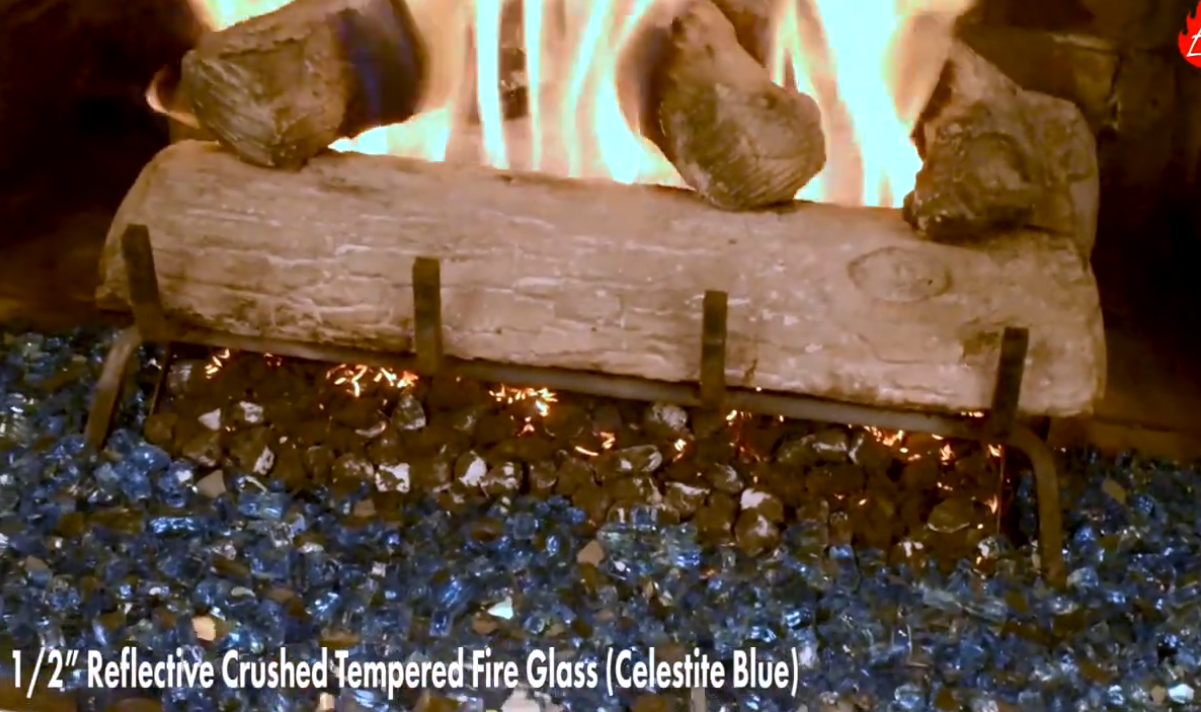 The look of a traditional fireplace with the dazzling sparkle of fire glass. Ember gas mixed with fire glass accents and complemented with glowing wool and neon embers. A Great look for a gas fireplace or log set